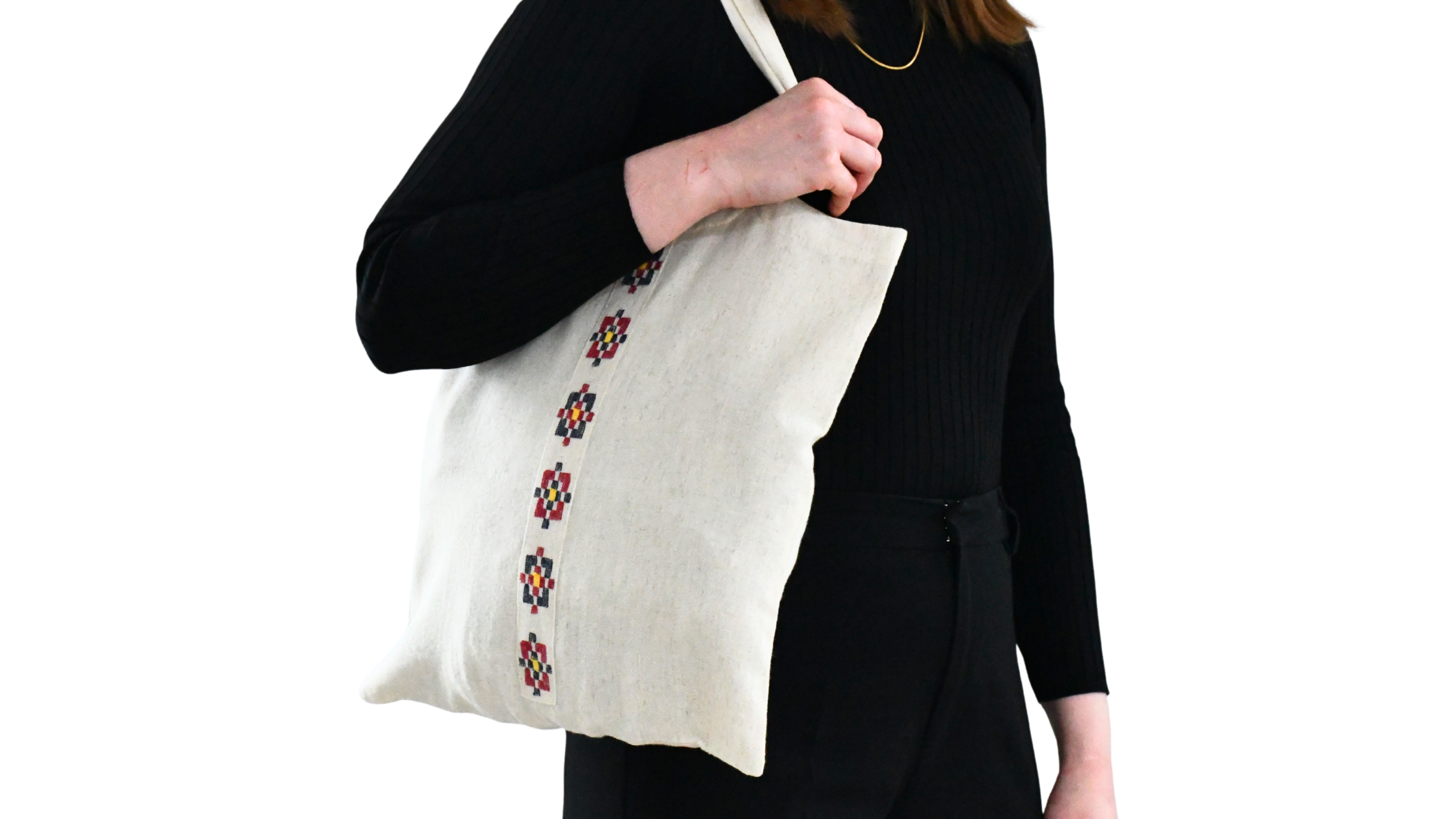 Derbent dokuma kumaşı kullanılarak üretilen çanta Derbent desenleri ile süslenmiştir.