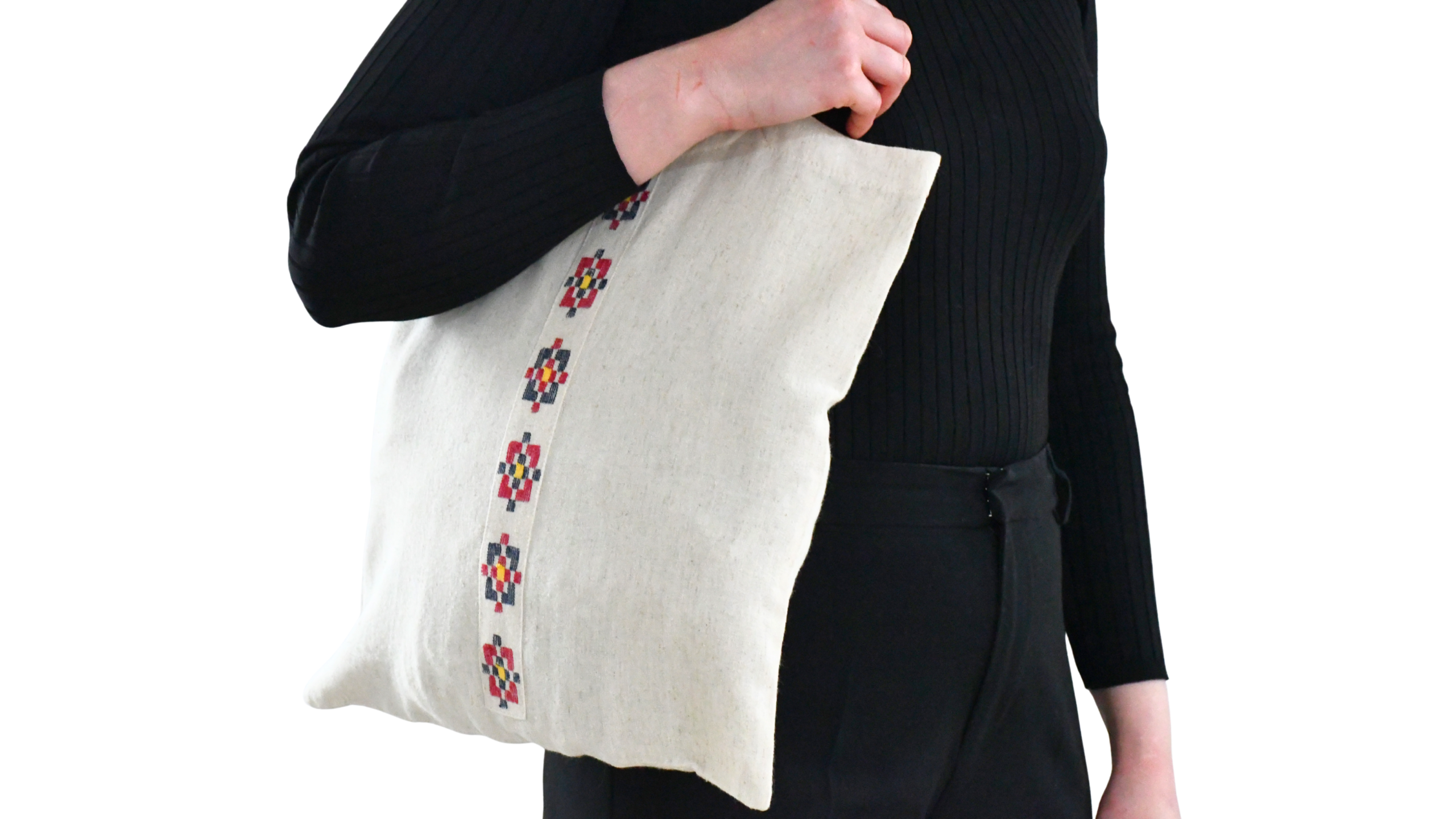 Ürün kumaşı %100 pamuk ipliğinden bez ayağı dokuma tekniği kullanılarak el işçiliği ile yapılmıştır.