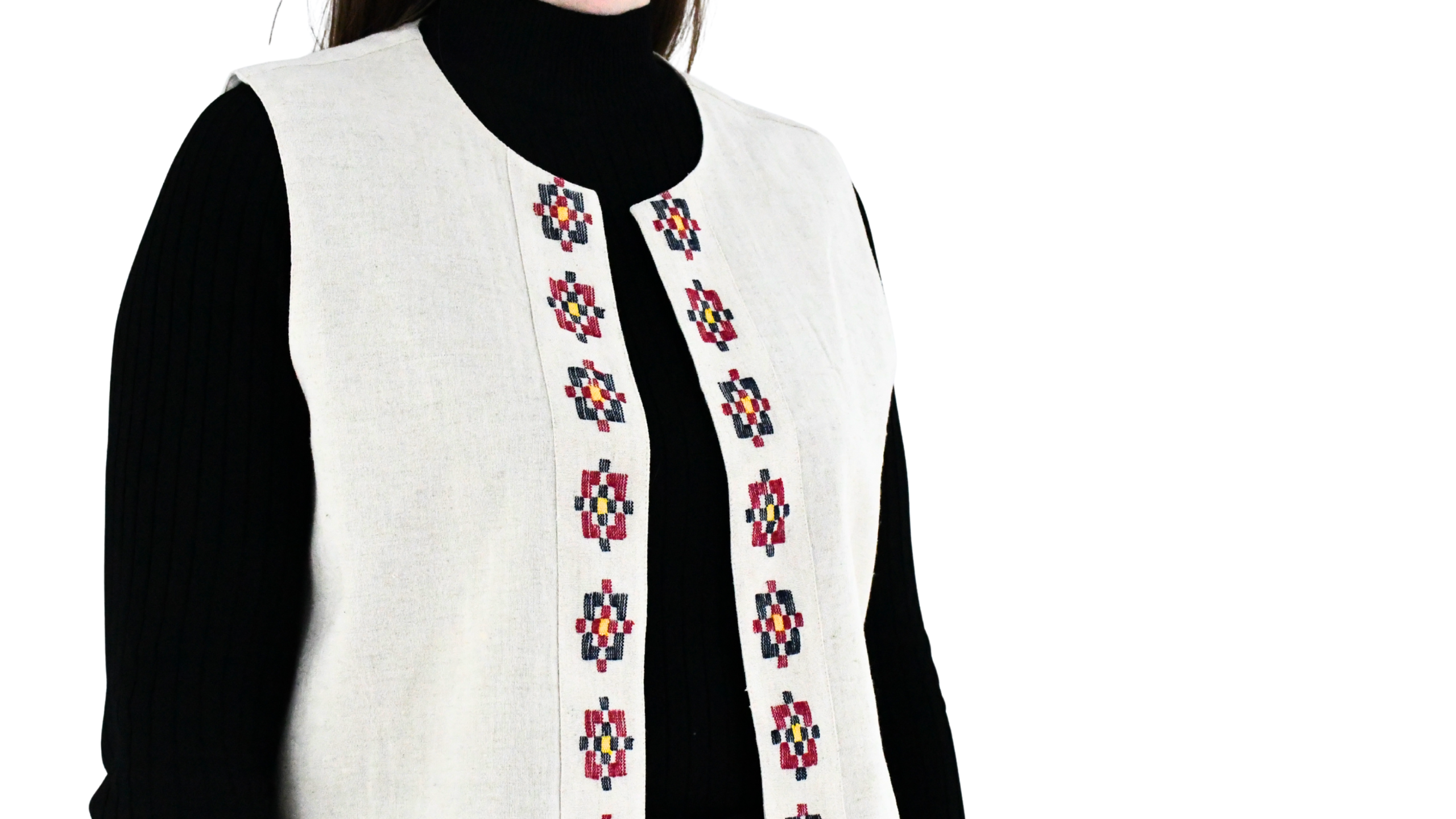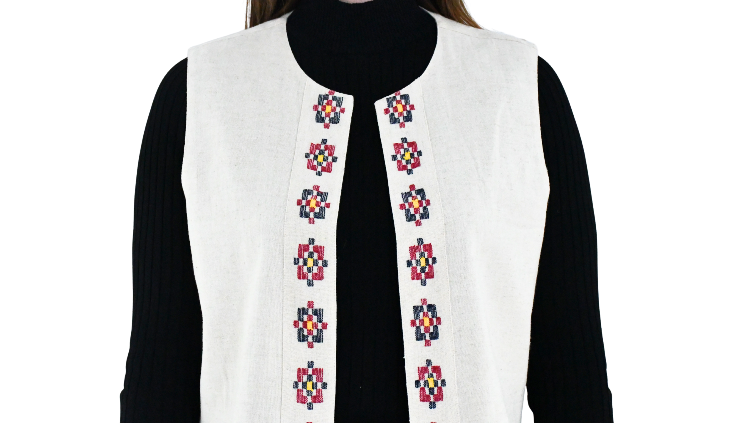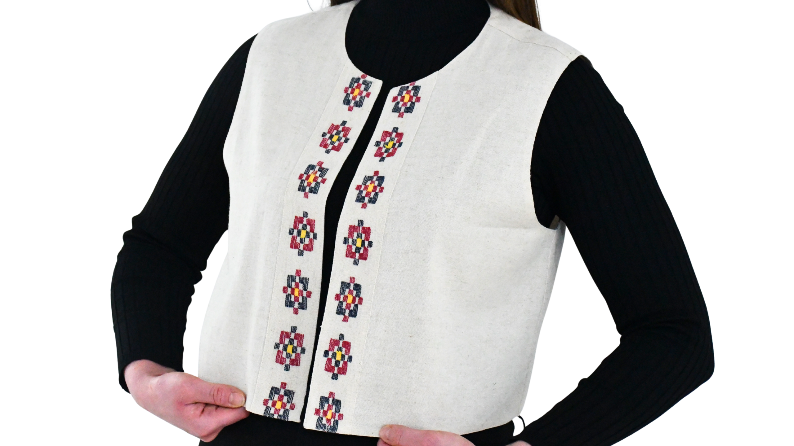 Derbent kumaşı ile kesilen yeleğin ön ortası derbent deseni ile süslenmiştir.